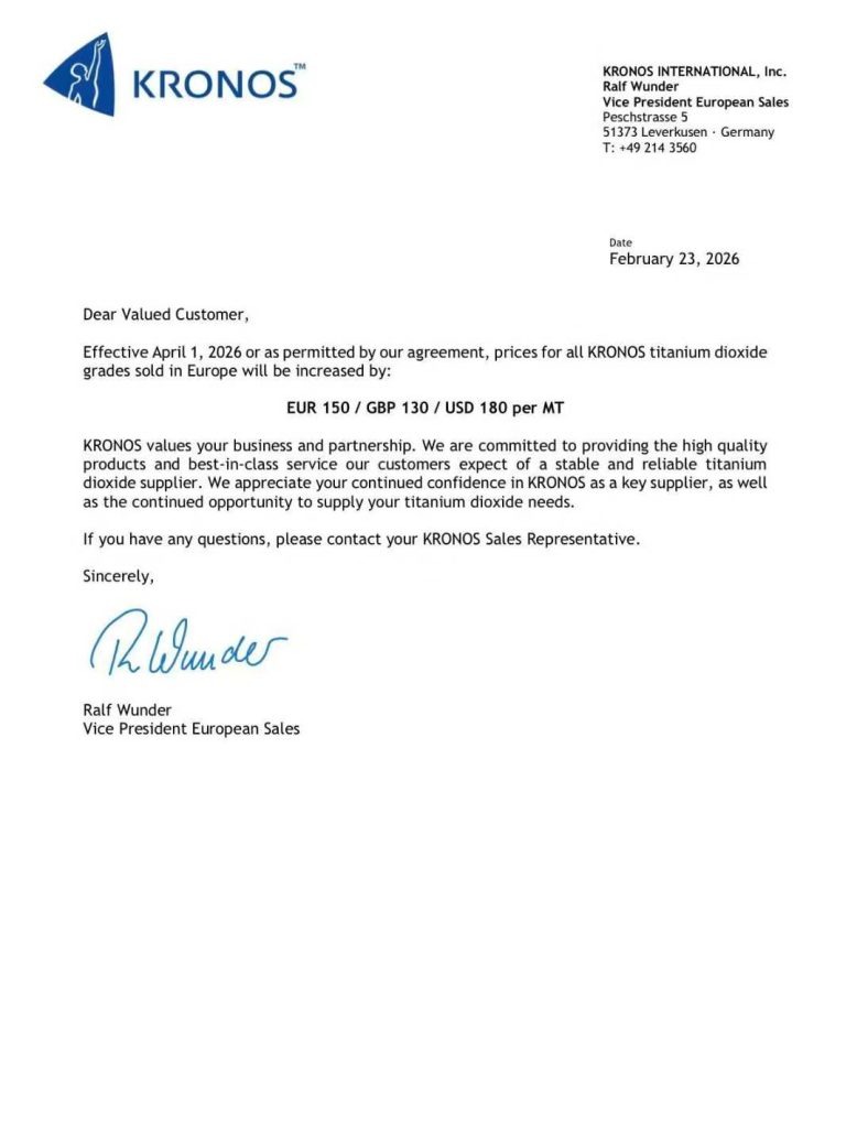 近日,全球钛白粉行业再传涨价信号。国际头部生产商 Kronos(康诺斯) 已正式宣布,自 2026 年 4 月 1 日 起,对其在欧洲市场销售的所有牌号钛白粉产品实施提价,涨幅为 EUR 150 / GBP 130 / USD 180 每吨。
