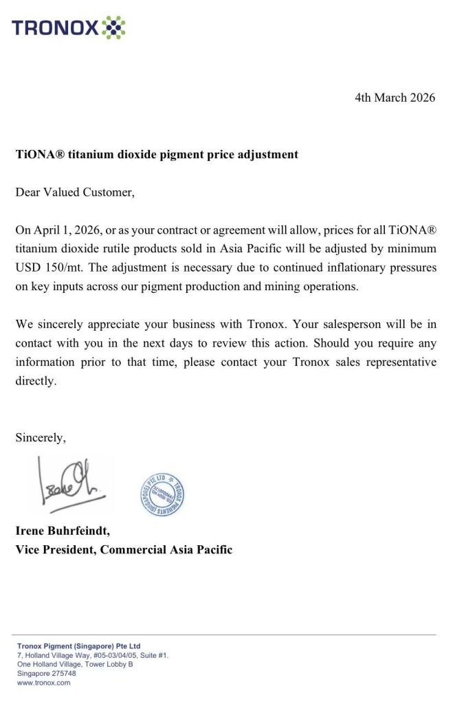 紧随其后, Tronox(特诺) 也于 3 月 4 日发布调价通知,自 2026 年 4 月 1 日 起,对亚太地区所有牌号 TiONA®金红石型钛白粉产品价格上调150 美元 / 吨,调价原因直指 “颜料生产和采矿业务中关键投入品持续的通胀压力”。这一全球性跟进动作,进一步强化了市场对钛白粉价格上行的预期。
